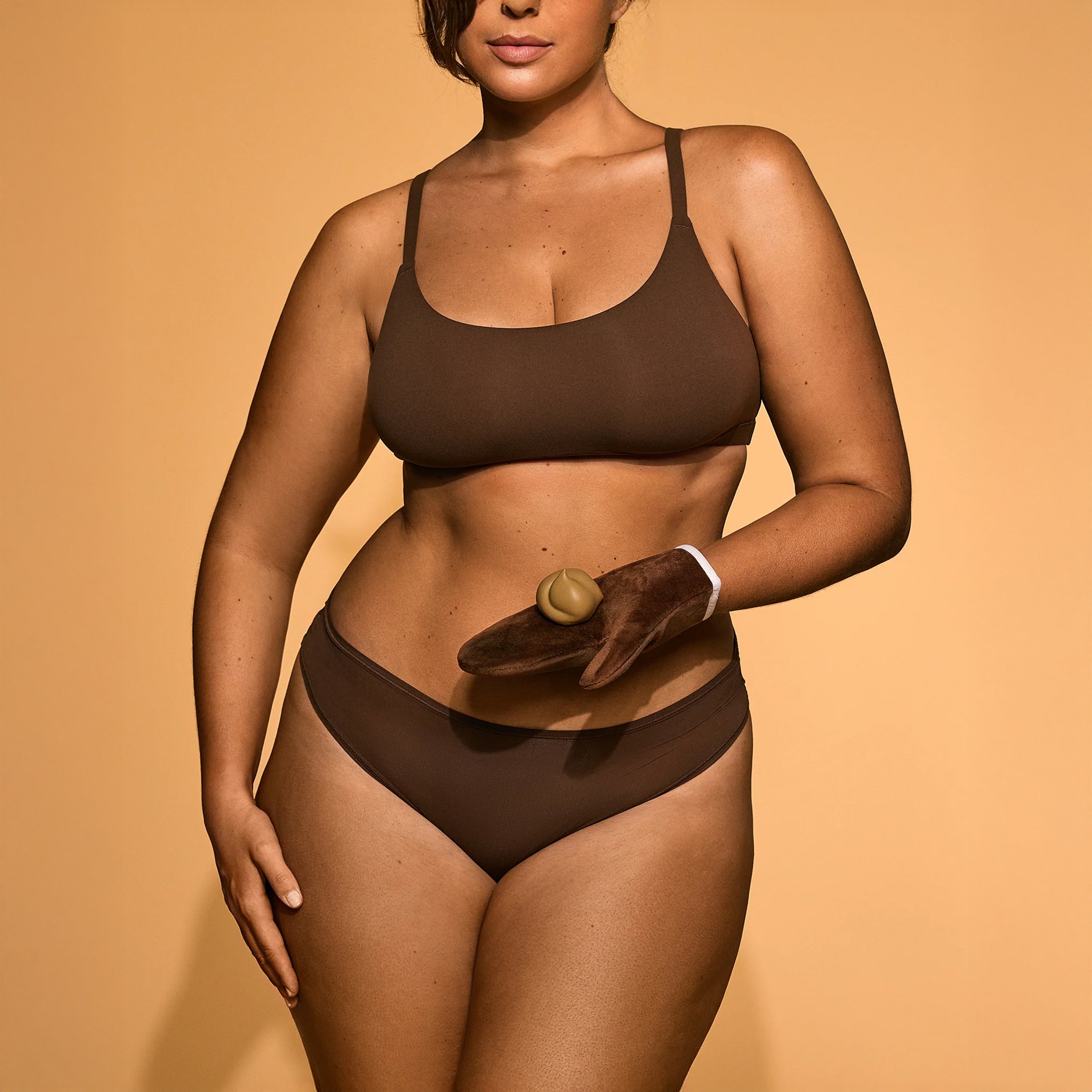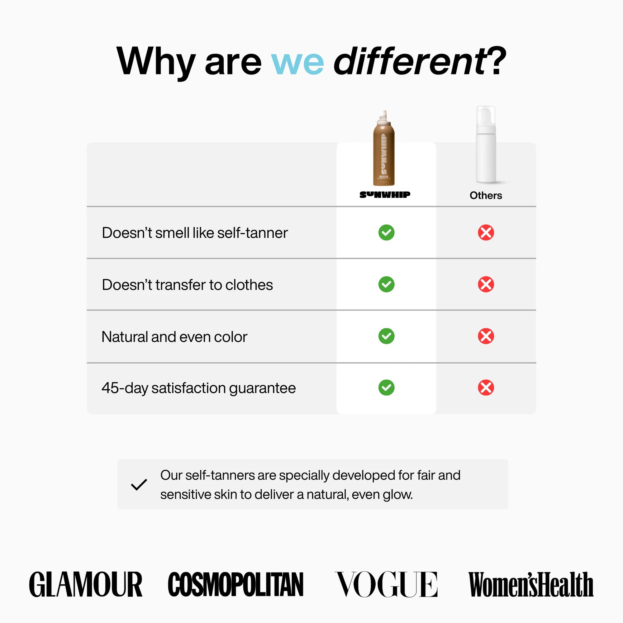 We've deliberately formulated our products to avoid the typical "self-tanner smell." Our Self-Tanning Drops have a neutral, clean scent, while our Self-Tanning Mousse features a fresh, mild melon fragrance that doesn't smell synthetic.
